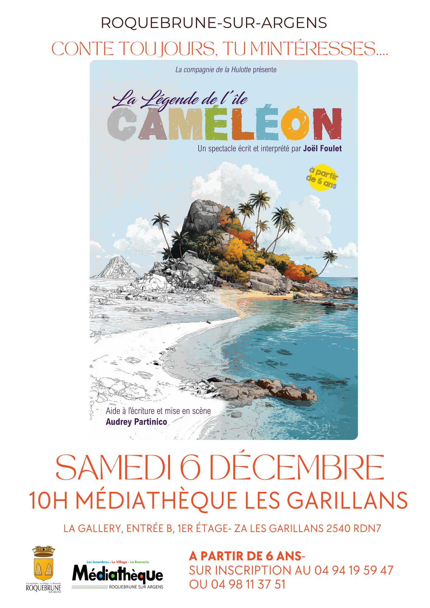 Spectacle jeunesse : La Légende de l’Île CaméléonLa Ville invite les familles à un voyage imaginaire plein de couleurs et d’aventures avec le spectacle La Légende de l’Île Caméléon, écrit et interprété par Joël Foulet et présenté par la compagnie de la Hulotte.Rendez-vous samedi 6 décembre à 10h à la Médiathèque Les Garillans pour découvrir cette histoire magique accessible à partir de 6 ans. Entre paysages exotiques, mystères et humour, les jeunes spectateurs seront embarqués dans une épopée ensoleillée mise en scène avec la complicité d’Audrey Partinico.L’événement se déroule à La Gallery, entrée B, 1er étage – ZA Les Garillans.Sur inscription : 04 94 19 59 47 ou 04 98 11 37 51.Un moment convivial et dépaysant à partager en famille !